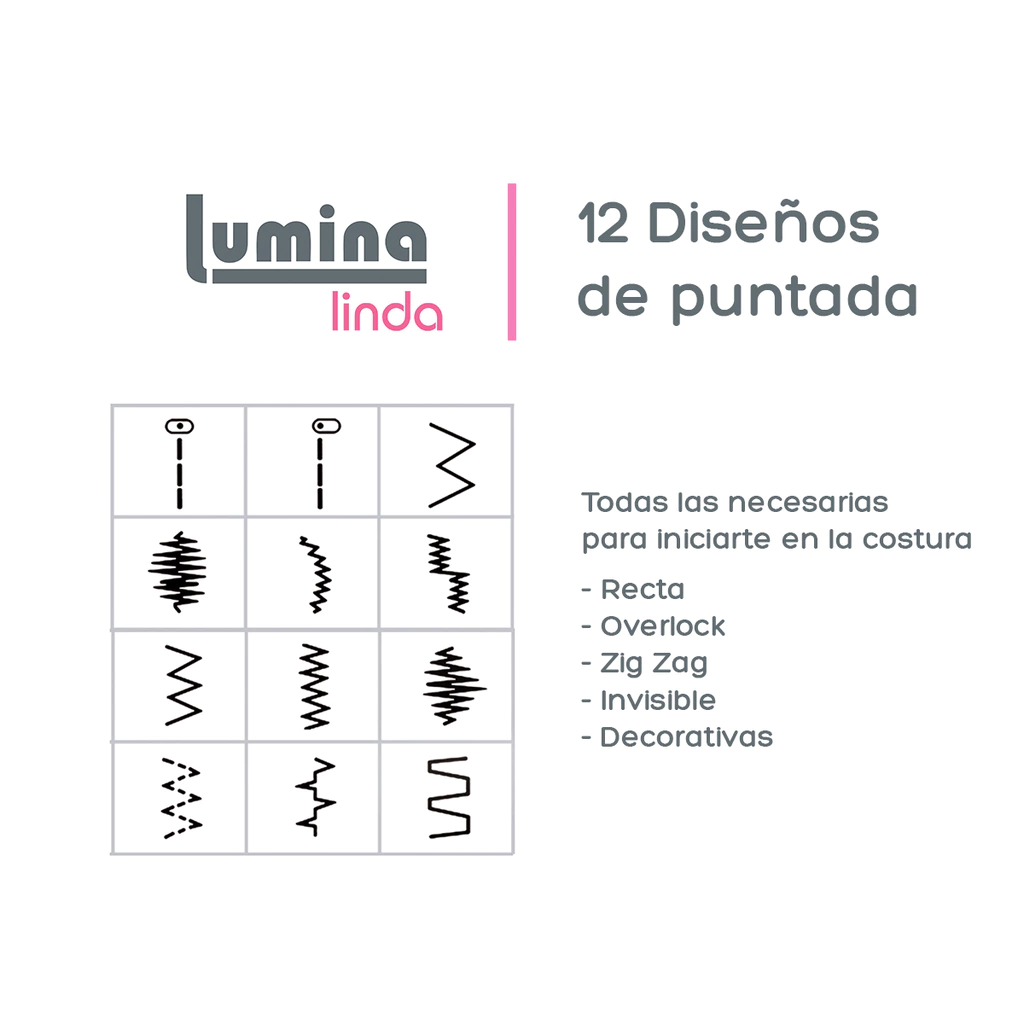 Lumina Linda es una máquina de iniciación. Es fácil de manejar, intuitiva y ligera. Por su tamaño podrás guardarla en cualquier sitio. Con 12 diseños de puntada, te permitirá hacer tus propios arreglos: hacer dobladillos, poner botones, coser cremalleras e incluso zurcir. Más abajo podrás ver en detalle las características. Si querés dar un paso más, te recomendamos Lumina Alma.